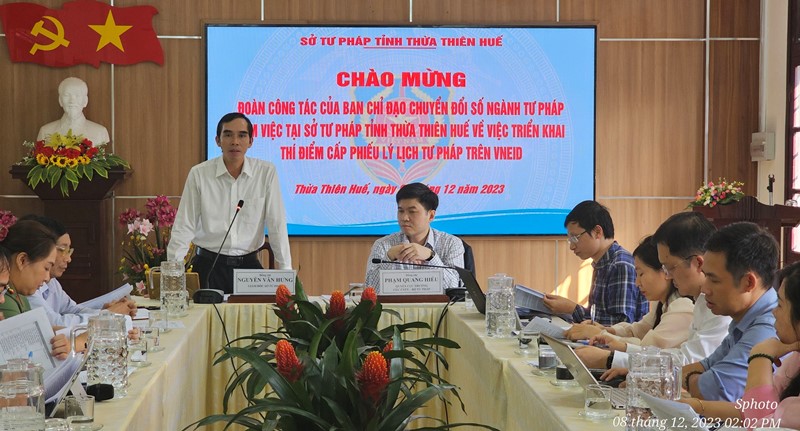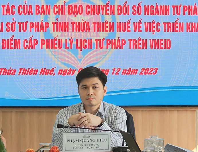Kết thúc buổi làm việc, đồng chí Phạm Quang Hiếu, Quyền Cục trưởng Cục Công nghệ thông tin, Trưởng đoàn công tác ghi nhận và đánh giá cao những kết quả Sở Tư pháp đã đạt được. Đồng thời khẳng định, quy trình cấp Phiếu lý lịch tư pháp trên ứng dụng định danh và xác thực điện tử VneID thể hiện quyết tâm chính trị rất cao của Bộ Tư pháp, Bộ Công an, Bộ Thông tin và Truyền thông; Ủy ban nhân dân tỉnh Thừa Thiên Huế. Đồng chí đề nghị, thời gian tới Sở Tư pháp và Sở Thông tin và Truyền thông, Công an tỉnh Thừa Thiên Huế tiếp tục có sự phối hợp chặt chẽ hơn nữa trong việc thực hiện nhiệm vụ mới được giao để triển khai thành công thí điểm cấp Phiếu lý lịch tư pháp trên ứng dụng định danh và xác thực điện tử VneID.