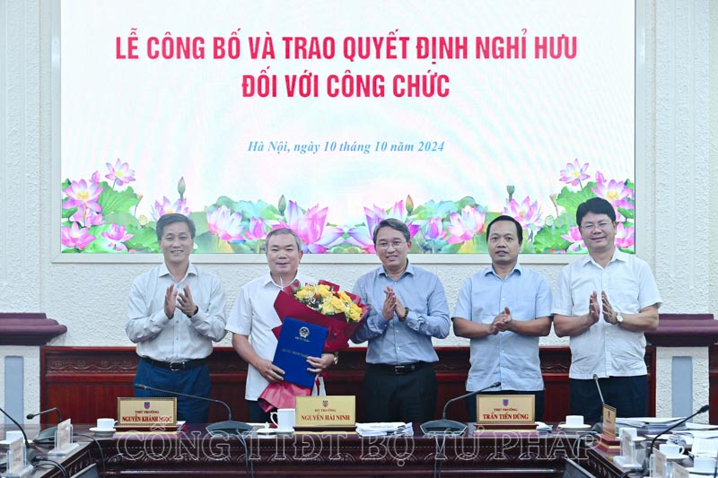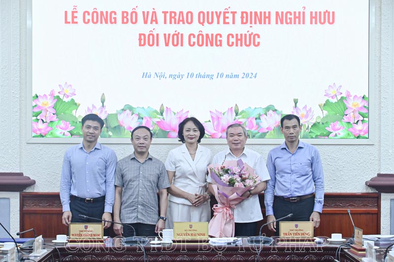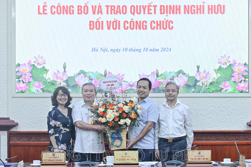 Tập thể Ban cán sự Đảng, Lãnh đạo Bộ Tư pháp trao Quyết định nghỉ hưu cho đồng chí Nguyễn Kim Tinh.