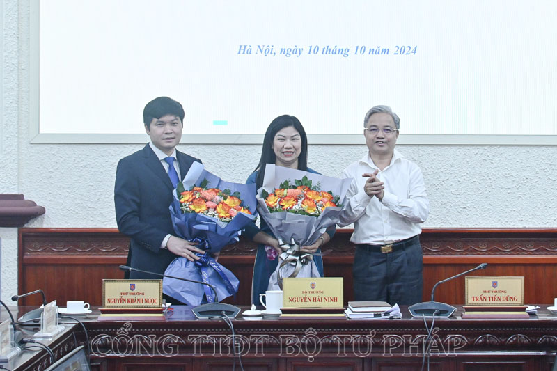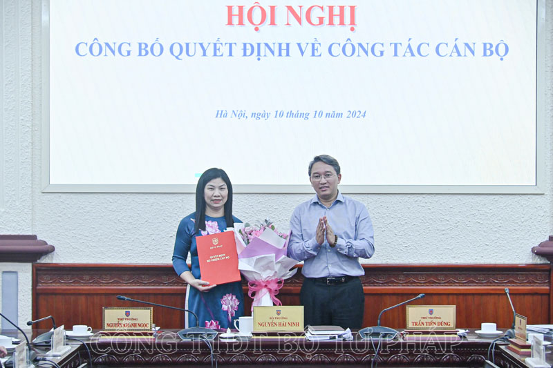 Cũng Hội nghị giao ban Lãnh đạo Bộ, Bộ trưởng Bộ Tư pháp Nguyễn Hải Ninh đã trao Quyết định về việc bổ nhiệm lãnh đạo cấp Vụ đối với 02 đồng chí.