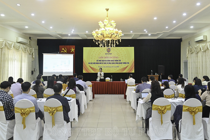Thực hiện Kế hoạch đào tạo, bồi dưỡng công chức, viên chức Bộ Tư pháp năm 2024 ban hành tại Quyết định số 2118/QĐ-BTP ngày 08/11/2024 của Bộ trưởng Bộ Tư pháp, ngày 03/12, Cục Công nghệ thông tin tổ chức Lớp bồi dưỡng về thuê dịch vụ công nghệ thông tin và các nội dung mới về đầu tư ứng dụng công nghệ thông tin. Lớp bồi dưỡng diễn ra trong 2 ngày, từ 03-04/12/2024 với sự chủ trì của đồng chí Phạm Đức Dụ, Phó Cục trưởng Cục Công nghệ thông tin.