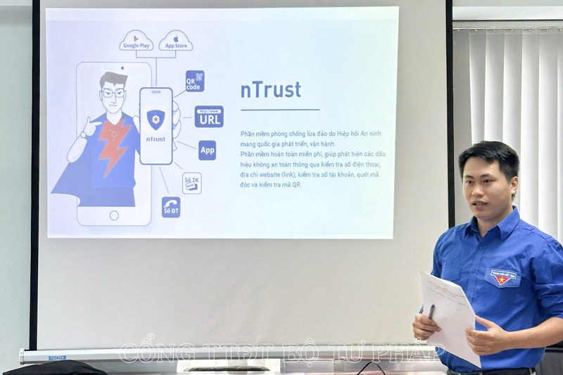 Tiếp đó, các đoàn viên Chi đoàn đã được đồng chí Trần Văn Dũng, Ủy viên Ban Chấp hành Chi đoàn giới thiệu về các buổi hội thảo của Bộ Thông tin và Truyền thông về an toàn, an ninh mạng và phần mềm Phòng chống lừa đảo trên không gian mạng nTrust. Phần mềm phòng chống lừa đảo nTrust được ra mắt vào ngày 30/7 bởi Hiệp hội An ninh mạng quốc gia. Đây là phần mềm giúp phát hiện lừa đảo qua cuộc gọi, web; phát hiện các dấu hiệu lừa đảo thông qua kiểm tra số điện thoại, số tài khoản, đường dẫn trang web.