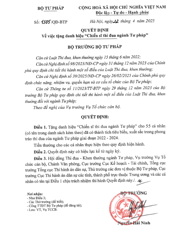 Ngày 22/4/2025, Bộ trưởng Bộ Tư pháp ký Quyết định số 1305/QĐ-BTP về việc tặng danh hiệu “Chiến sĩ thi đua ngành Tư pháp” cho các cá nhân có thành tích tiêu biểu, xuất sắc trong phong trào thi đua của ngành Tư pháp giai đoạn 2022 – 2024, trong đó có đồng chí Nguyễn Việt Tú, kỹ sư công nghệ thông tin thuộc Trung tâm Công nghệ và Dịch vụ số Tư pháp, Cục Công nghệ thông tin.