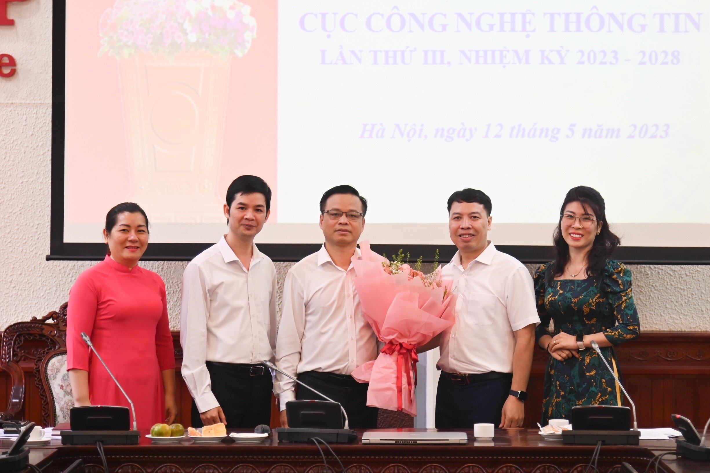 Đồng chí Khương Thị Thanh Huyền và đồng chí Tạ Thành Trung chụp hình lưu niệm cùng Ban chấp hành Công đoàn cơ sở Cục Công nghệ thông tin nhiệm kỳ 2023 - 2028