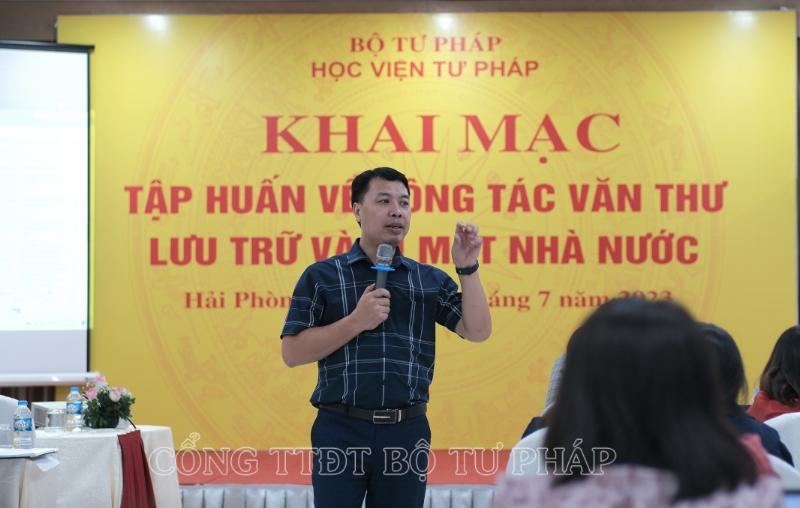 Đồng chí Trần Hoài Nam – Giám đốc Trung tâm thông tin, Cục CNTT, Bộ Tư pháp giới thiệu về Hệ thống quản lý văn bản và điều hành tại buổi Tập huấn