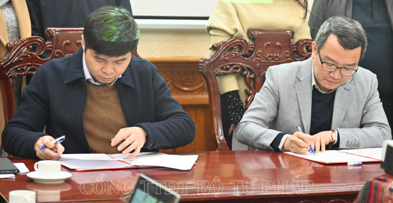 Quyền Cục trưởng Cục Công nghệ thông tin Phạm Quang Hiếu và Cục trưởng Cục Kiểm tra văn bản QPPL Hồ Quang Huy ký kết Quy chế phối hợp và Biên bản bàn giao tại buổi Lễ.
