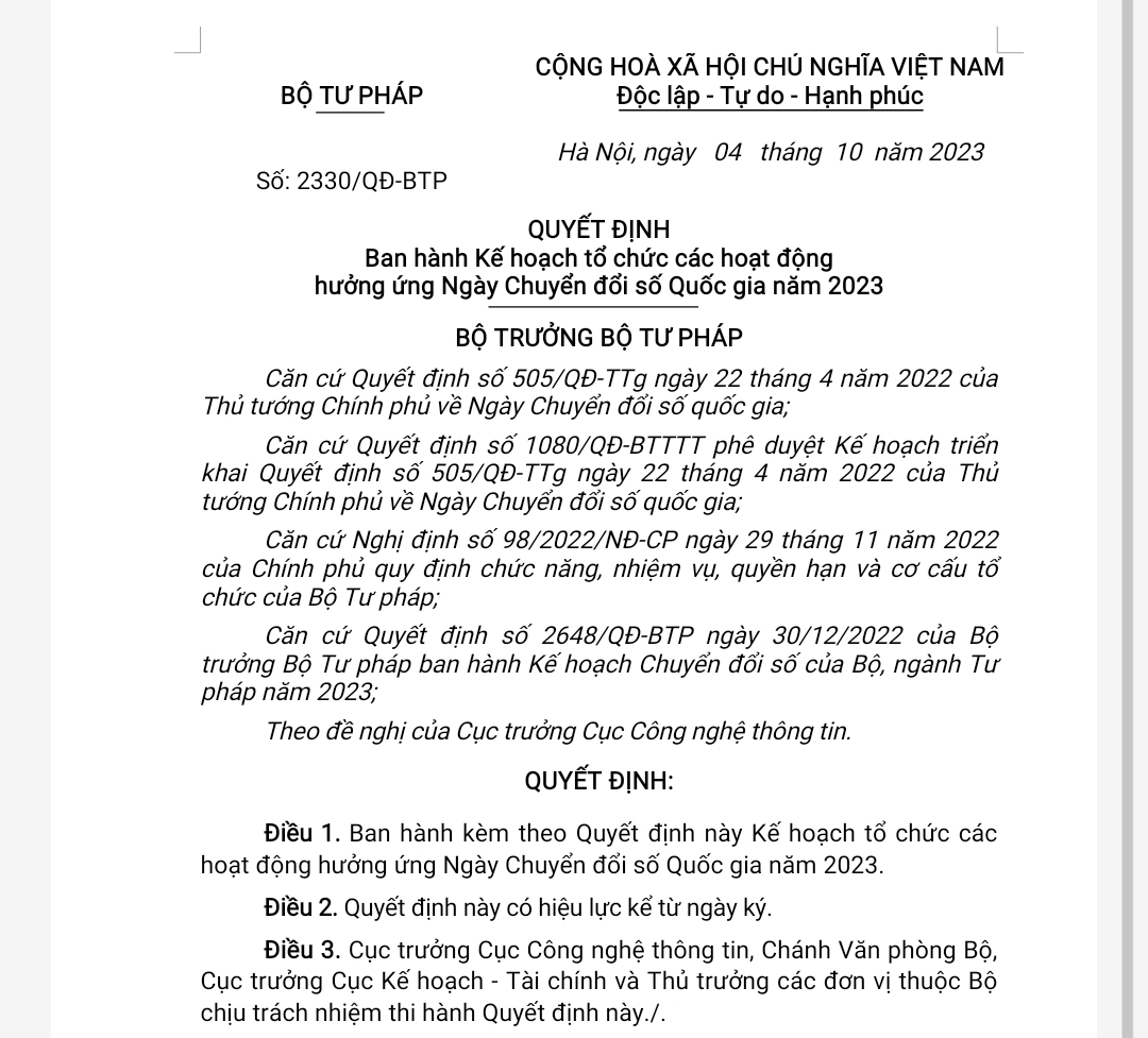 Chiều 30/8, Cục Công nghệ thông tin, Bộ Tư pháp tổ chức Lễ kỷ niệm 20 năm ngày thành lập (08/9/2003 - 08/9/2023) và vinh dự đón nhận Huân chương Lao động hạng Ba. Tham dự buổi Lễ có Bộ trưởng Lê Thành Long, nguyên Bộ trưởng Hà Hùng Cường, Thứ trưởng Nguyễn Khánh Ngọc, Thứ trưởng Mai Lương Khôi, nguyên Thứ trưởng Đinh Trung Tụng, Phó Bí thư Thường trực Đảng ủy Bộ Nguyễn Kim Tinh, nguyên Cục trưởng Cục Công nghệ thông tin (CNTT) Nguyễn Tiến Dũng, các nguyên Phó Cục trưởng Nguyễn Chí Dũng, Lê Văn Duyên; đại diện lãnh đạo các đơn vị, các tổ chức chính trị xã hội thuộc Bộ; đại diện lãnh đạo một số đơn vị thuộc Bộ Công an, Bộ Quốc phòng, Bộ Thông tin và Truyền thông, Ban Cơ yếu Chính phủ.