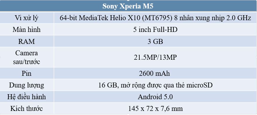 Chỉ sau thời gian ngắn rò rỉ, Xperia M5 đã chính thức được giới thiệu với những cải tiến mạnh mẽ về camera so với Xperia M4 Aqua ra mắt cách đây không lâu. Máy được trang bị camera 21.5 MP, thiết kế chống nước, màn hình 5 inches Full HD. Các chi tiết cụ thể bạn có thể xem bảng dưới đây.